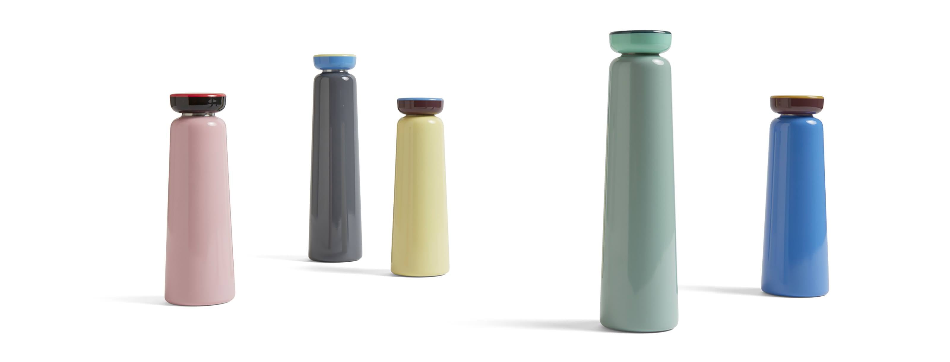 The Sowden water bottle with contrasting lid. Contrasting colors make for a playful expression with George Sowden’s bottle series. Crafted in stainless steel with a plastic screw lid, the functional design is suitable for containing hot and cold drinks.